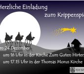 Krippenspiel Liebe Familien, wir laden Sie ganz herzlich zu unseren Krippenfeiern ein. Eine große Gruppe von Engeln, Hirten, Wirte, Augustus, Soldaten, …