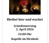 Taizé-GebetBleibt hier und wachet Am Gründonnerstag, 02. April sind sie um 24 Uhr zu einem Taizégebet in die Kapelle im …