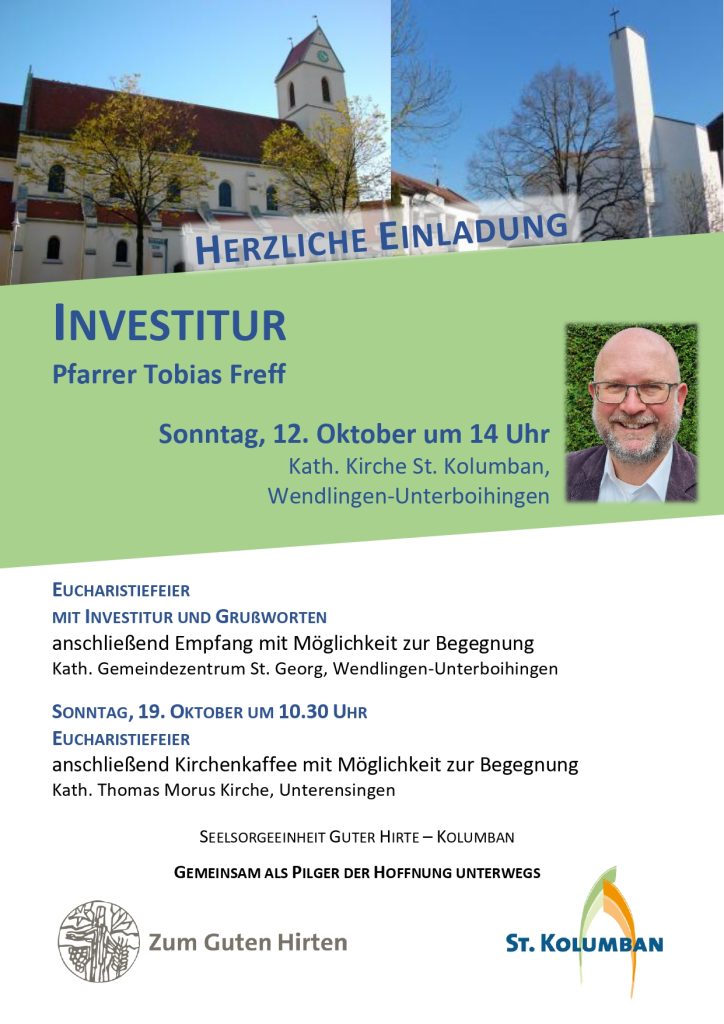 Wem es nicht möglich ist, an der feierlichen Investitur dabei zu sein, hat am darauffolgenden Sonntag, 19. Oktober um 10:30 Uhr, Thomas Morus Kirche in Unterensingen und dem anschließenden Kirchenkaffee die Möglichkeit zur Begegnung und zum Kennenlernen.