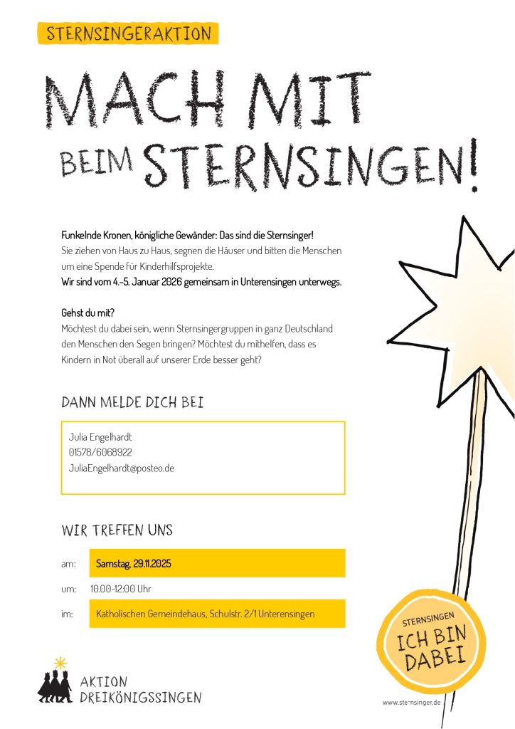 Das Vortreffen der Sternsinger findet am Samstag, 29.11., 10-12 Uhr im kath. Gemeindehaus Unterensingen statt. Wer an diesem Tag keine Zeit hat, aber trotzdem gerne bei der Sternsinger-Aktion mitmachen möchte, kann sich Anmeldezettel mit Datenschutzerklärung sowie weitere Infomaterialien auf der Homepage (www.guterhirte.eu) herunterladen. Anmeldeschluss für die Aktion ist der 5.12.25. Auf Euer Kommen freuen wir uns!