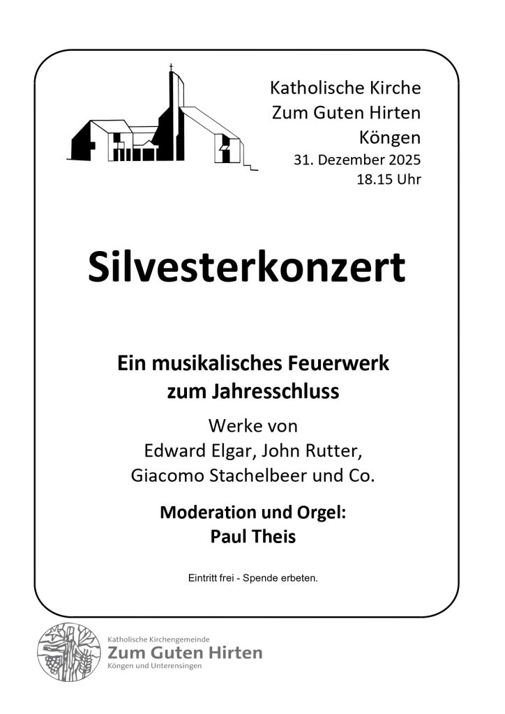 Und für Ihre Planung des Silvesterabends hier die wichtigsten Daten: Kirche Zum Guten Hirten um 18.15 Uhr; Dauer: 1h; Eintritt frei; um eine Spende wird gebeten.