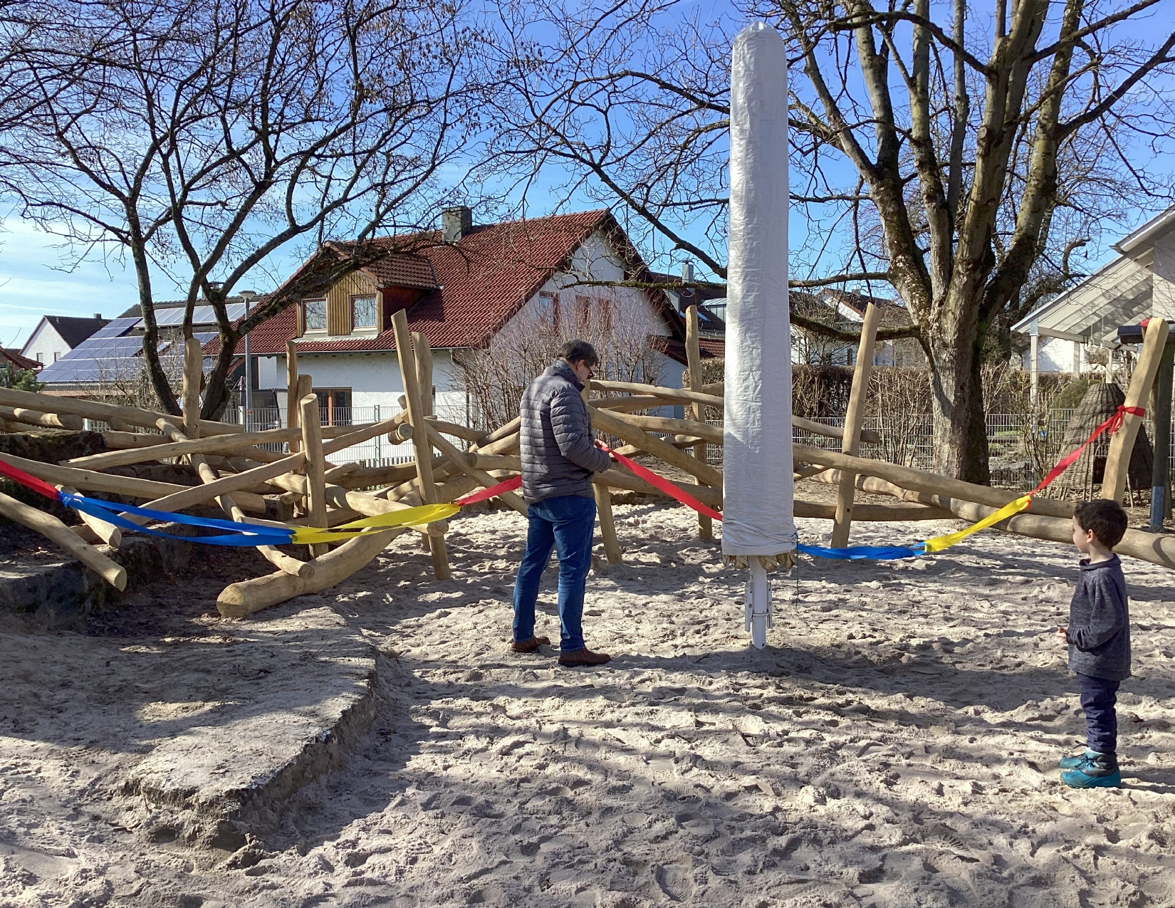 Wir freuen uns sehr über unser neues Spielgerät und eine neue Rutsche in unserem Außenbereich. Nach der überraschenden Sperrung der alten Geräte aus Sicherheitsgründen im Mai 2025 durften wir am Donnerstag, den 26.02.2026 endlich unser schönes, neues Spielgerät, ein Baumstamm-Mikado und die Rutsche, einweihen und die Eröffnung mit einer kleinen Feier zelebrieren.