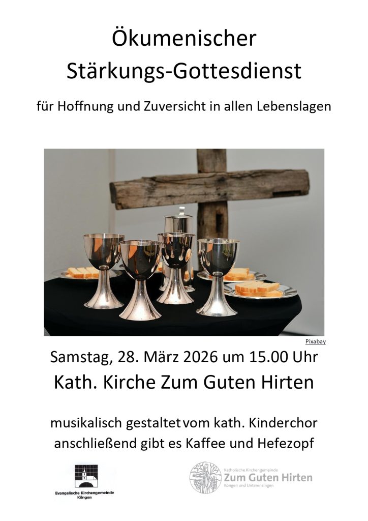 Stärke, Mut und Zuversicht brauchen wir für unseren Alltag. Das Evangelium wird uns vom Kinderchor musikalisch verkündet. Wer möchte, bekommt den Segen persönlich als Stärkung zugesprochen. Im Agapemahl feiern wir die Gemeinschaft mit Gott und untereinander.