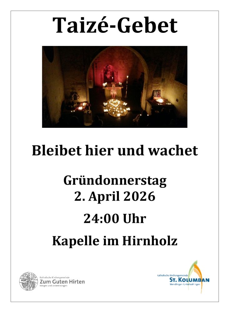 Am Gründonnerstag, 02. April sind sie um 24 Uhr zu einem Taizégebet in die Kapelle im Hirnholz in Wendlingen eingeladen.