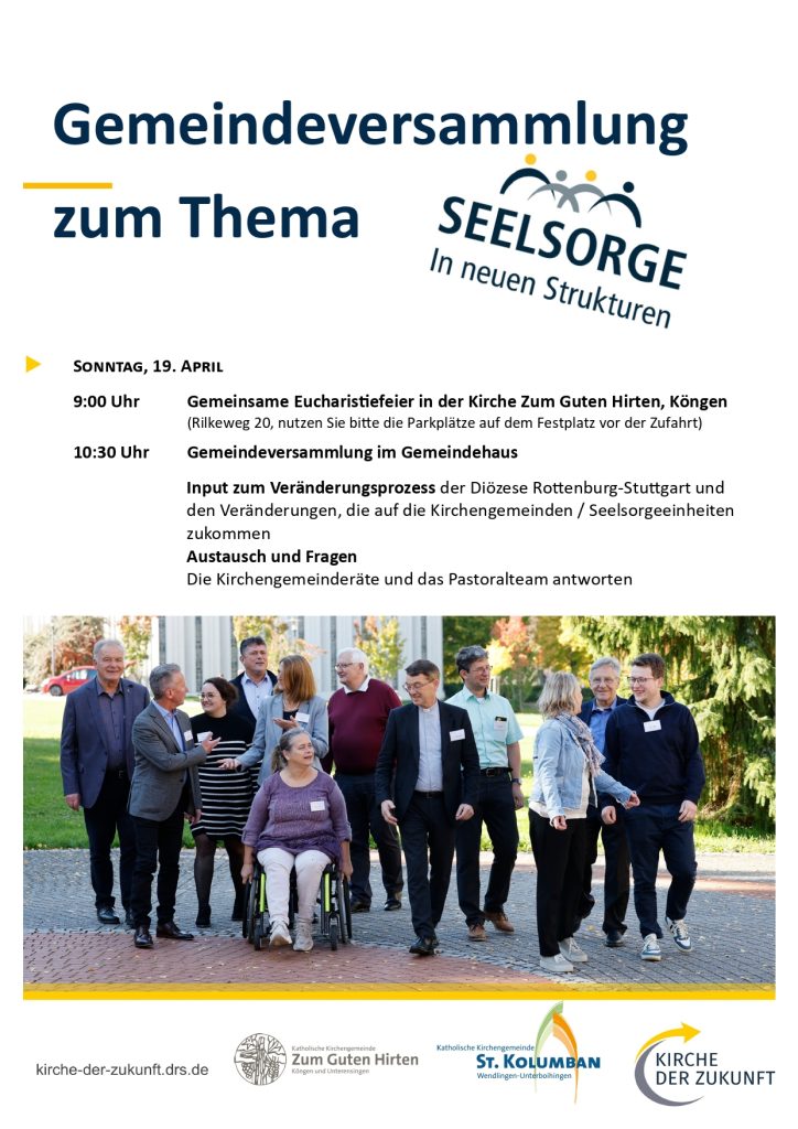 Bei einer gemeinsamen Gemeindeversammlung für die Seelsorgeeinheit am Sonntag, 19. April 2026 um 10.30 Uhr im Gemeindehaus in Köngen wollen wir über die Gründe, die Rahmenbedingungen und die daraus resultierenden Überlegungen informieren und ins Gespräch kommen. Bitte merken Sie sich den Termin schon in Ihrem Kalender vor!