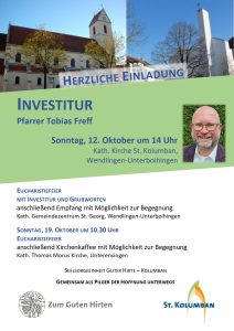 Wem es nicht möglich ist, an der feierlichen Investitur dabei zu sein, hat am darauffolgenden Sonntag, 19. Oktober um 10:30 Uhr, Thomas Morus Kirche in Unterensingen und dem anschließenden Kirchenkaffee die Möglichkeit zur Begegnung und zum Kennenlernen.