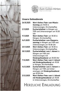 Das Pfarrbüro Köngen ist in der Zeit vom 27.10. bis 31.10. geschlossen. In dringenden Fällen wenden Sie sich bitte an das Pfarrbüro St. Kolumban in Wendlingen-Unterboihingen.