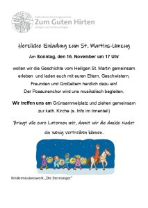 Dann folgen wir dem Martin in einer Lichterprozession bis zur katholischen Kirche. Dort hören wir den zweiten Teil der Geschichte und wollen alle Martinslieder singen, die wir kennen. Der Posaunenchor wird uns musikalisch begleiten und die Jugendfeuerwehr Unterensingen wacht über unseren Umzug.