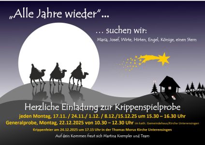 Alle Kinder sind mit ihren Familien eingeladen, gemeinsam mit uns St. Martin zu feiern. Wir beginnen am Sonntag, den 16. November 2025 um 17:00 Uhr am Grünsammelplatz mit dem Martinsspiel. Der heilige Martin kommt mit seinem Pferd angeritten und wir hören den ersten Teil der Geschichte.
