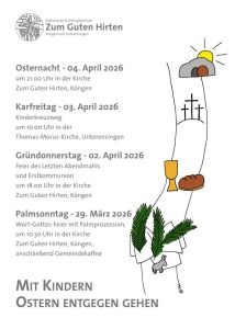 Am Karfreitag gibt es, zusätzlich zu den Gottesdiensten (Kinderkreuzweg, Betstunde, Karfreitagsliturgie, Karmette) in allen Kirchen die Möglichkeit zur Kreuzverehrung. Sie können dies in der Kirche St. Kolumban in Wendlingen und der Thomas Morus Kirche in Unterensingen ab 16 Uhr, im Anschluss an die Karliturgie, wahrnehmen; in der Kirche zur Allerheiligsten Dreifaltigkeit in Oberboihingen und der Kirche Zum Guten Hirten in Köngen im Zeitraum von 15 – 18 Uhr.